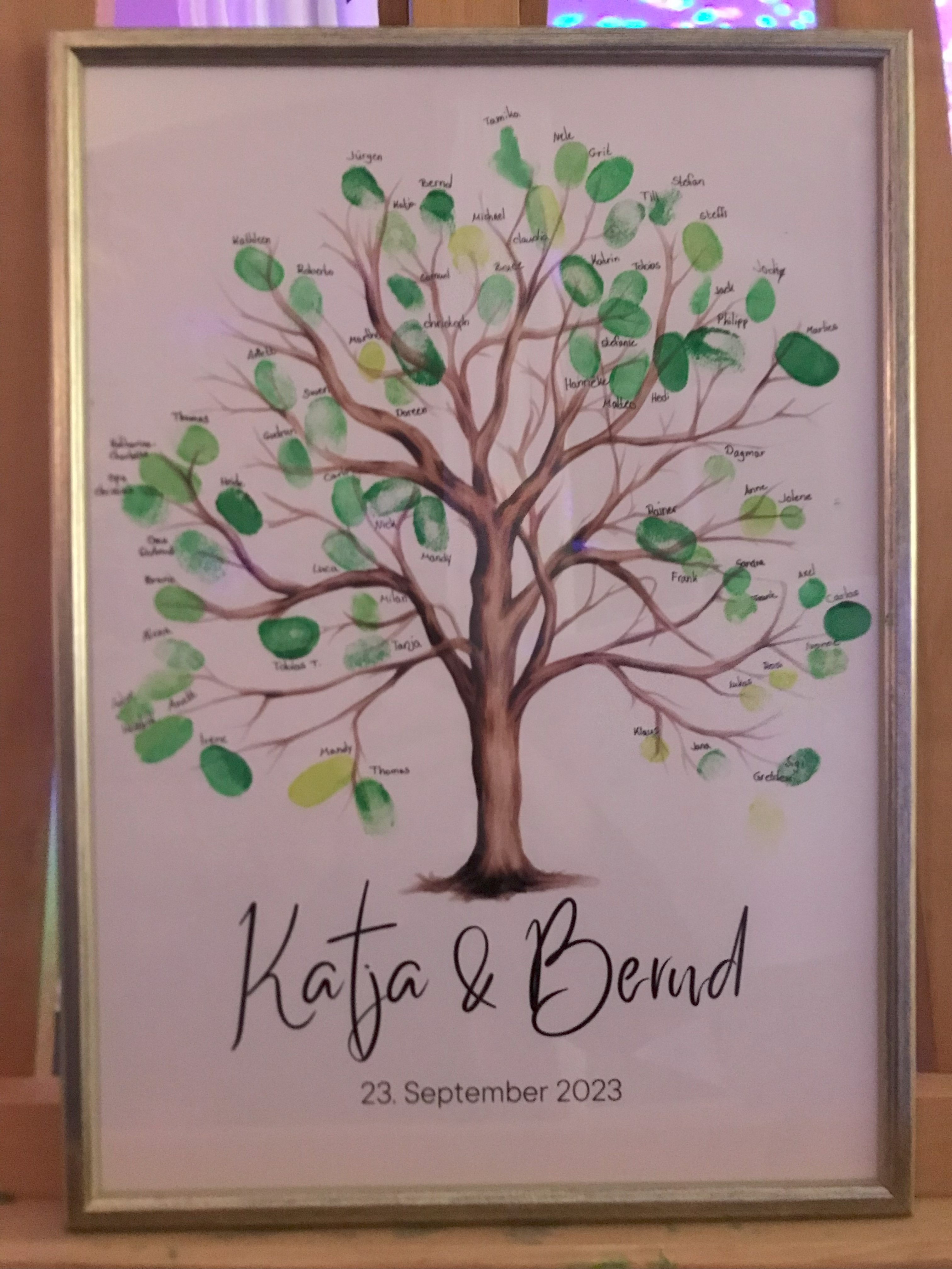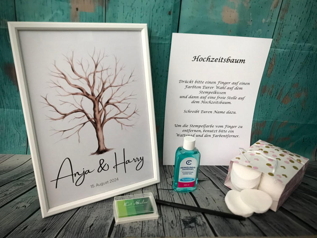 Das Foto vom fertigen Baum haben wir zur Hochzeitsfeier aufgenommen, nachdem sich alle Gäste verewigt hatten. Wir haben Stempelfarbe in 4 Grüntönen benutzt. Stift ist Fineliner schwarz.