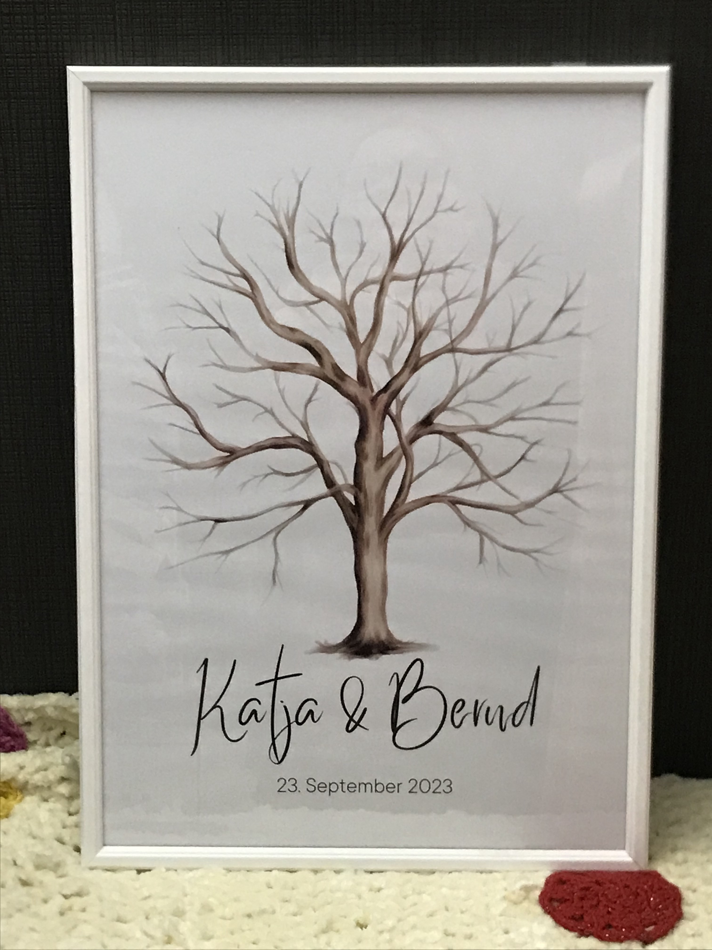 -> Zur Größenentscheidung A3 oder A4: Wir waren ca. 70 Gäste und der Baum hatte die Größe A3. Wie man sieht, ist noch Platz, so dass es locker für bis zu 100 Gäste gereicht hätte. Wer also eine kleinere Feier hat, kann mit A4 Format nichts falsch machen.